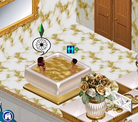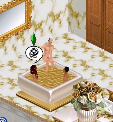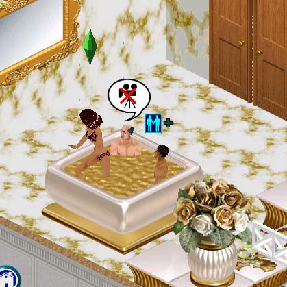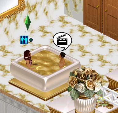 Director's Commentary: Spa set by Parsimonious. These scenes were shot on the same lot as all the fancy hotel banquet scenes in earlier chapters. I've now added a spa & a bedroom to the 2nd floor. All 'guests' are SS Somebodies, teleported by the juniper bush teleporter by Sim Logical. I usually use a mood enhancer plant like the Leisure or Party plant from Sim Logical to keep their basic mood levels up, but for them to want to use spa items, their comfort needs to be down. I also use the Visitor Controller from Sim Logical to control the guests, but I let a few roam around free, too, to use the spa or eat from the buffet & pass out on the floor. |