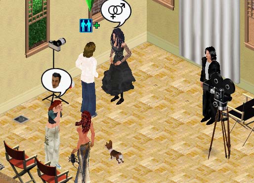 Director's Commentary: The photo session scene was accomplished using serveral items from Sim Logical. First, all characters (except Byron, this was shot in his house) were summoned to the lot using the juniper bush teleporters, which allow you to choose the outfit they arrive in. Astrid & Gavin were summoned in the HF outfits I got to be their costumes. (Gavin's was made for me by Ashaunda of Sims Addiction, Astrid's I got from Amazon Sims.) Shay & Alison were summoned in regular clothes. Gavin & Astrid were using the enforceable speaking points during the picture shooting sequence. These allow you to force any Sim on the lot to stand & speak, until you release them. Shay & Alison were sitting on enforceable director's chairs, which allow you to force any Sim on the lot to sit & stay until you release them. Also, you can't see it in the shots, but I was using the Sim Logical party plant, which maxes out all the needs of every Sim on the lot, except social. So when they were released from the chairs & the speaking points, the only thing they wanted to do was socialize, as opposed to scattering around the lot looking for food, fun or a bathroom.