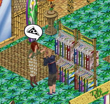 Coby leads her to the food court & hangs around while she eats. Coby's demeanour & accent are right out of a surfer movie. He tells her he loves her accent. Moira finds him kind of charming. He invites her up to the tiki bar for a drink.