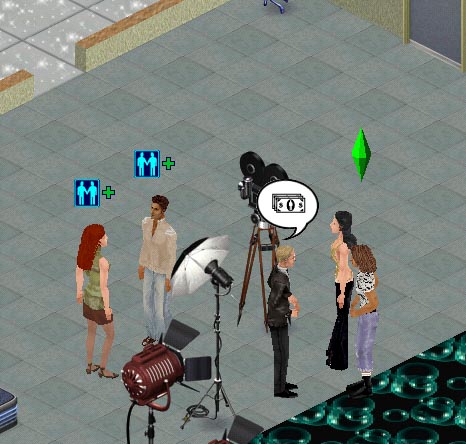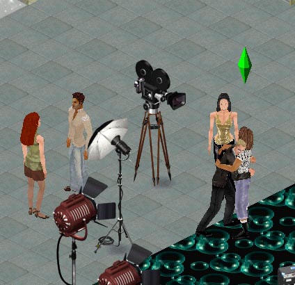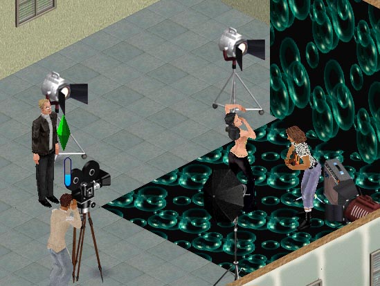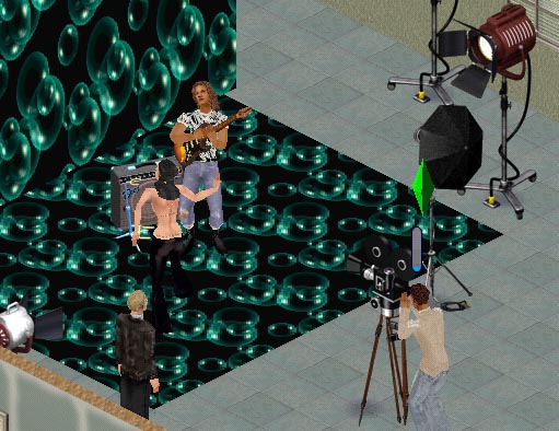 | Video shoot: Model is using Sim Logical's 'posing spot' to 'dance'. Bill is standing on the 'standing spot'. The movie camera is from Cheap Frills.