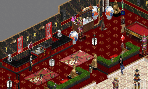 Good Luck Club: Bar, sushi, karaoke & guitar. Get the patch from Laphelot's Sim's Solutions so Sims can usethe guitar while DT. Bar set & matching wall & floor by The Well Dressed Sim. Rug & matching vase part of 'Sprit' bedroom set at Parsimonious.Amplifiers & guitar pedals by Around the Sims. |