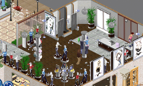 Funky Sims Shop: clothing satore with custom NPC by Colorized Sims. perfume displays (jewelry) & lighting are by Around the Sims.  Large paintings by Livin-it-up. Windows by Jendea Simtecture. |
