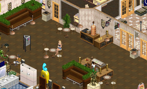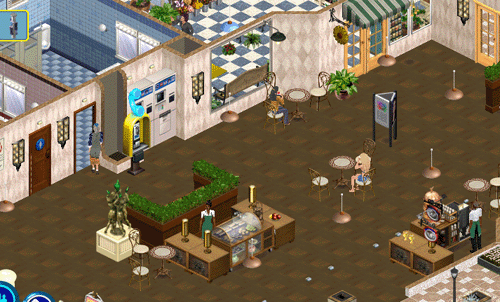 Lobby, 1st floor. Cafe & pastry carts, payphone, ATMs, elevator, restrooms. Everything you expect from a mall lobby! Lobby signs by The Well Dressed Sim, elevator sign by Sim Gypsy, benches by SIMcredible, cafe chair & table, wall by Livin-it-up, ceiling lights & candles by Around the Sims. |