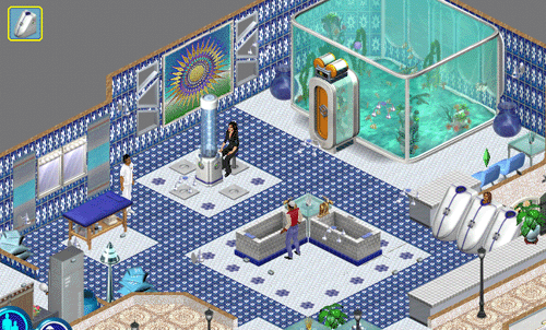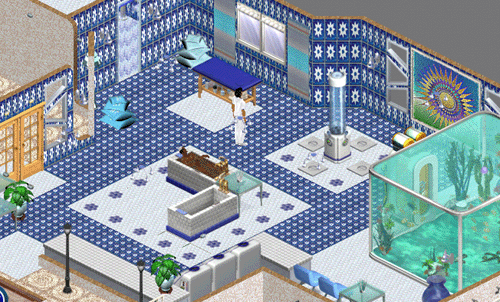 Spa: Scuba tank, steam bath, spa bath, oxygen bar, massage. Stained glass window, wall & Floors by Livin-it-up. Blue glass vase & scatter cushions by Parsimonious, ceiling lights & candles by Around the Sims, silk tapestries by Juniper Sun |
