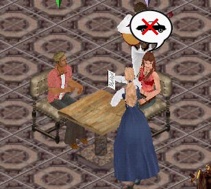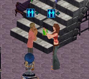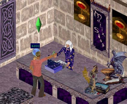 In Merlin's Magix Shop, Ulises buys Heather an overpriced souvenir. Luckily for him, his obsession with crime fighting & his lack kof a social life has allowed Ulises to sock away a lot of Simoleons, so he can afford to impress a girl, if he has a mind to. (magic shop by Debby Sims and Elegant Sim Fashions)