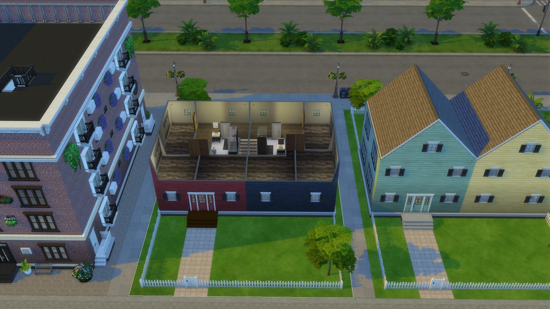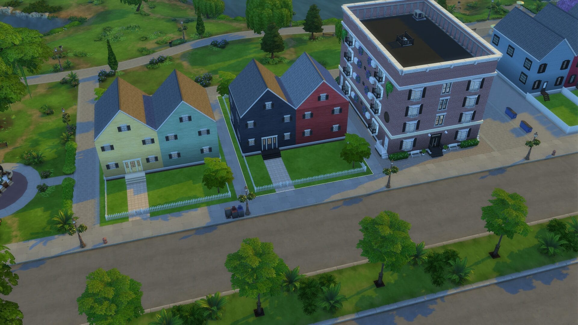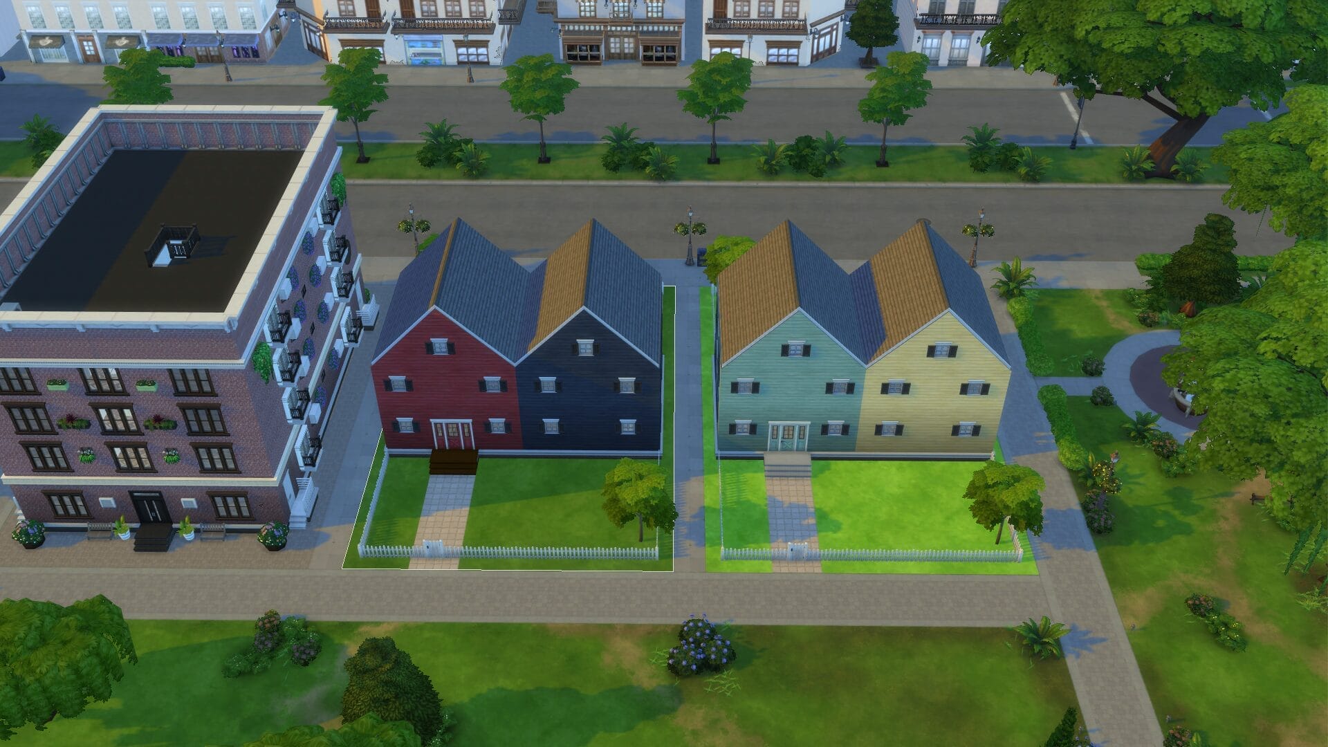 Duplex (1 and 2) – This lot is one of two that were repeated in the neighborhood. I loved the concept and design, so I wanted more of them side by side. I had fun making each duplex have their own front yard. You could always turn off residential rental and turn it into a 2 family lot (ie grandparents + family) if you wanted.