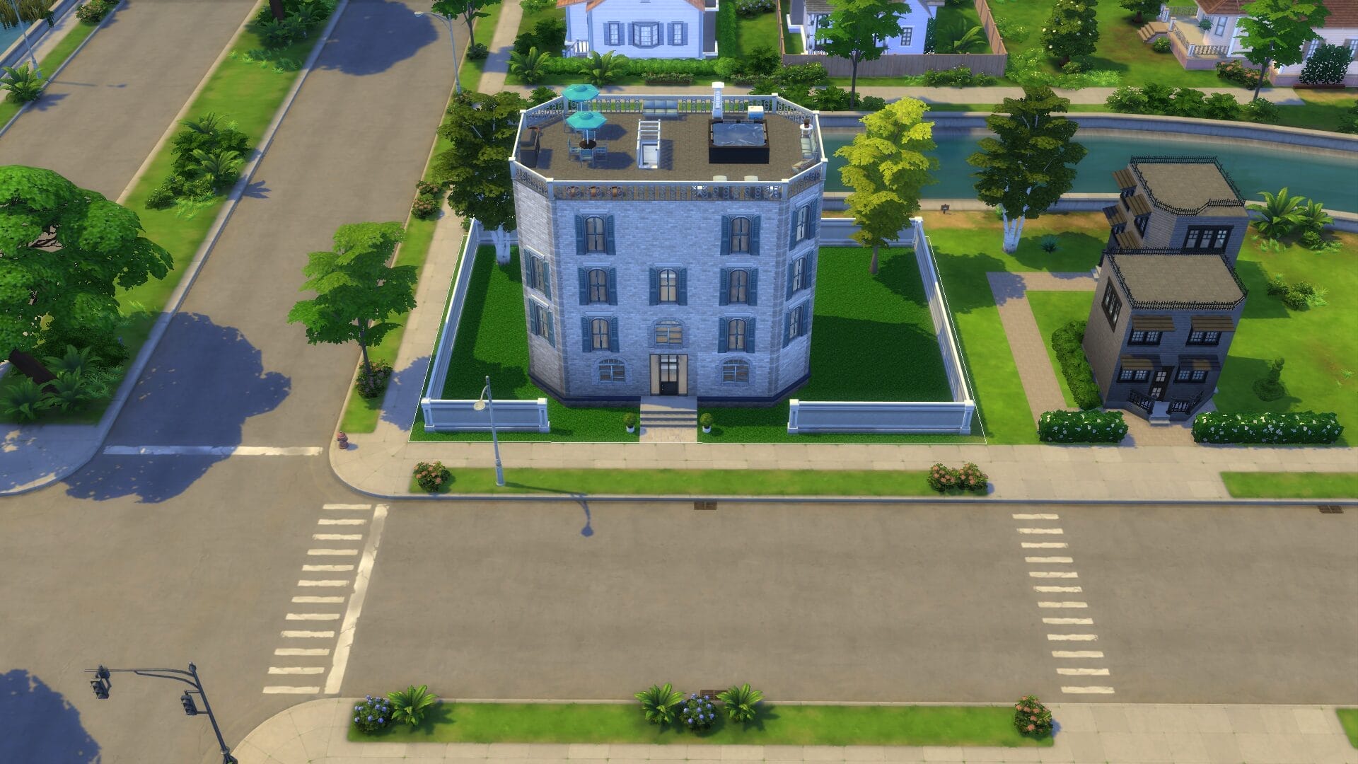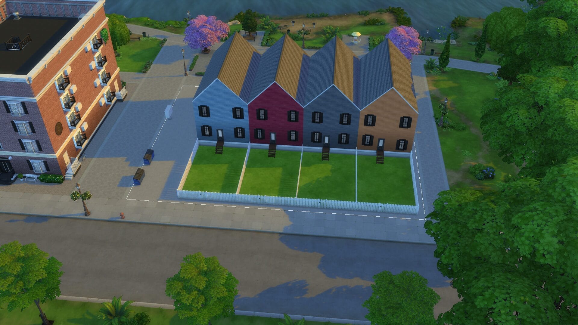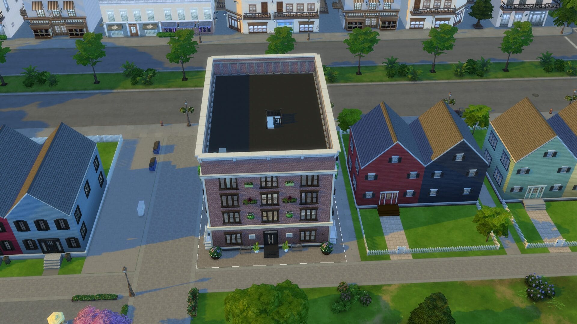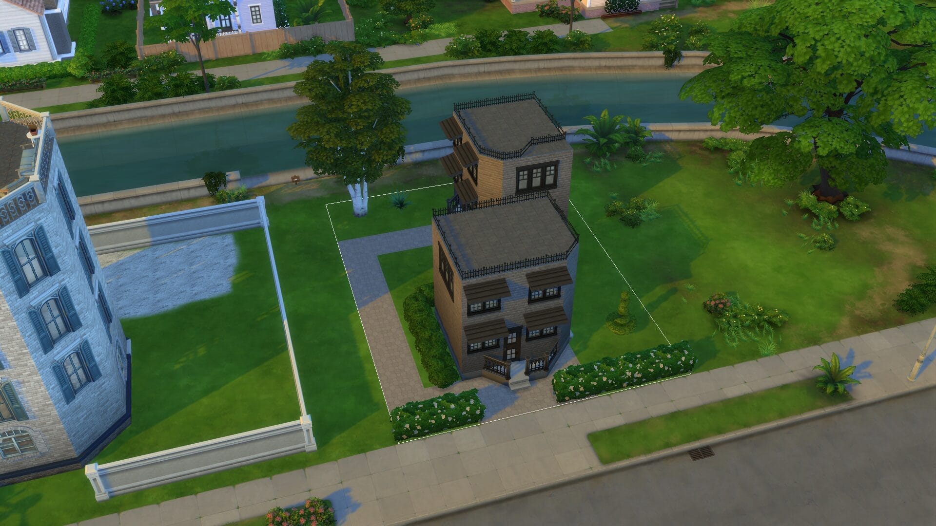 Sentinel Apartments – This was the first apartment building I built since For Rent came out. I might have went too far on its size. However, I absolutely love how it turned out and there are direct entrances to all the ground floor apartments. All of the homes/apartments on the canal have entrances on both side so that it looks good in manage worlds (I hated it looking like the back from afar). Some of the apartments have two stories. I’m excited to play this one in live mode. I always live in an apartment first with a sim because owning a house right off the bat feels “weird”.