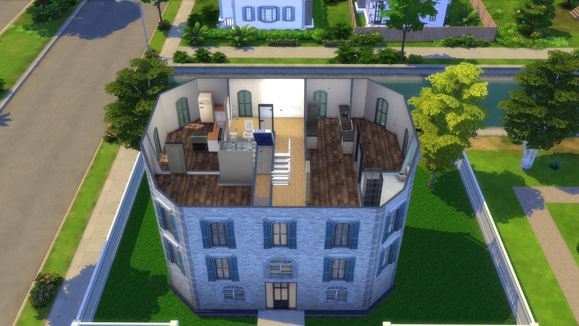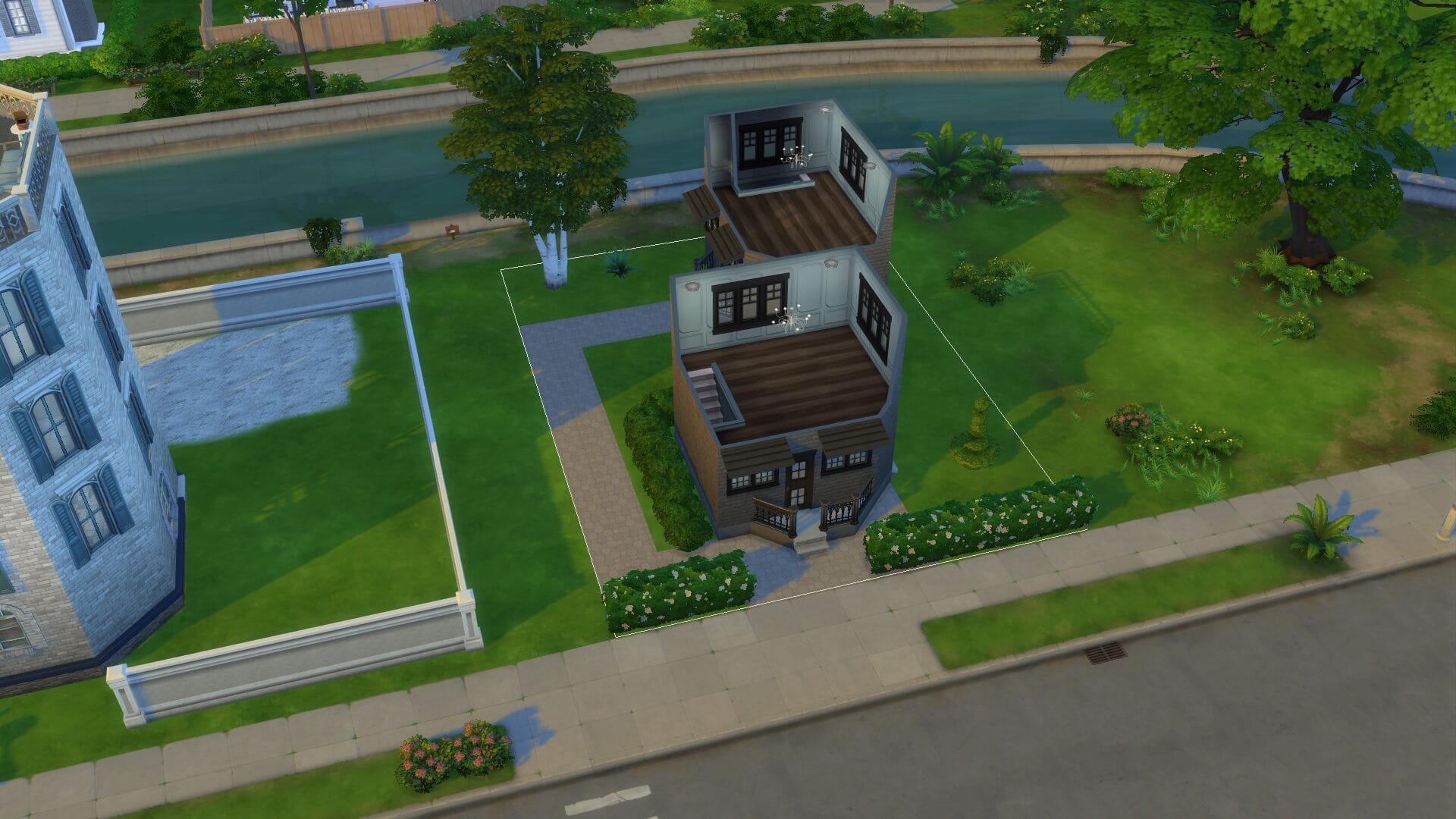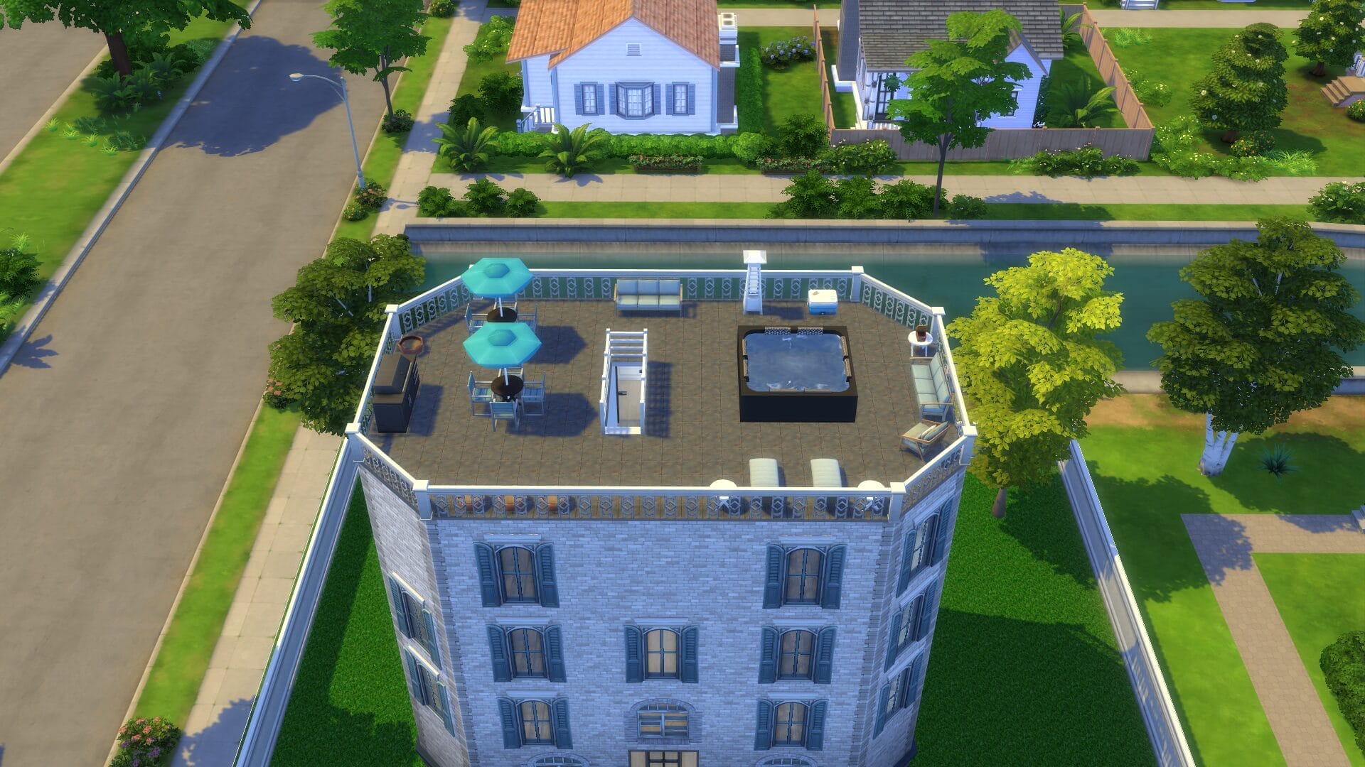 Sentinel Apartments – This was the first apartment building I built since For Rent came out. I might have went too far on its size. However, I absolutely love how it turned out and there are direct entrances to all the ground floor apartments. All of the homes/apartments on the canal have entrances on both side so that it looks good in manage worlds (I hated it looking like the back from afar). Some of the apartments have two stories. I’m excited to play this one in live mode. I always live in an apartment first with a sim because owning a house right off the bat feels “weird”.