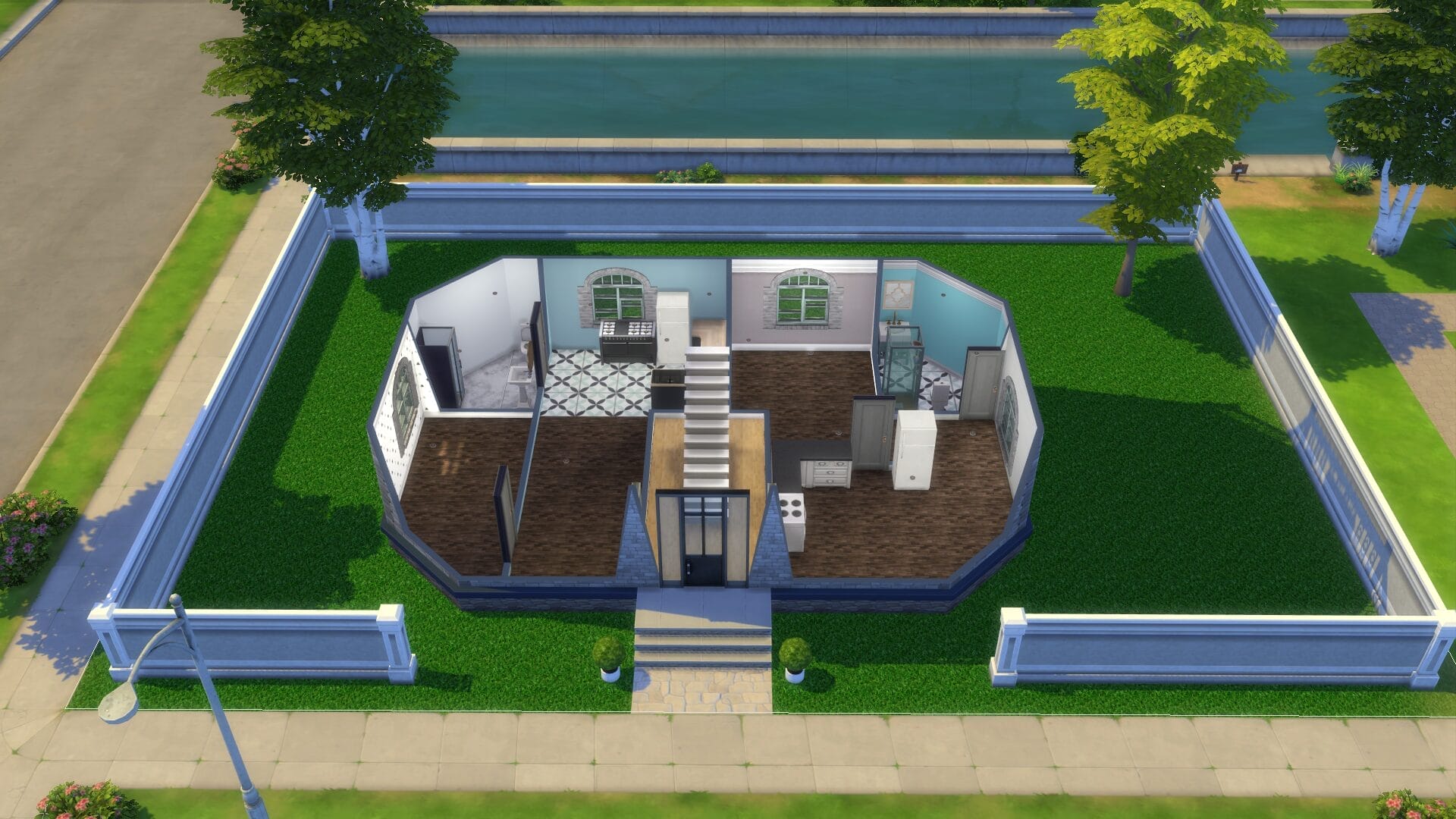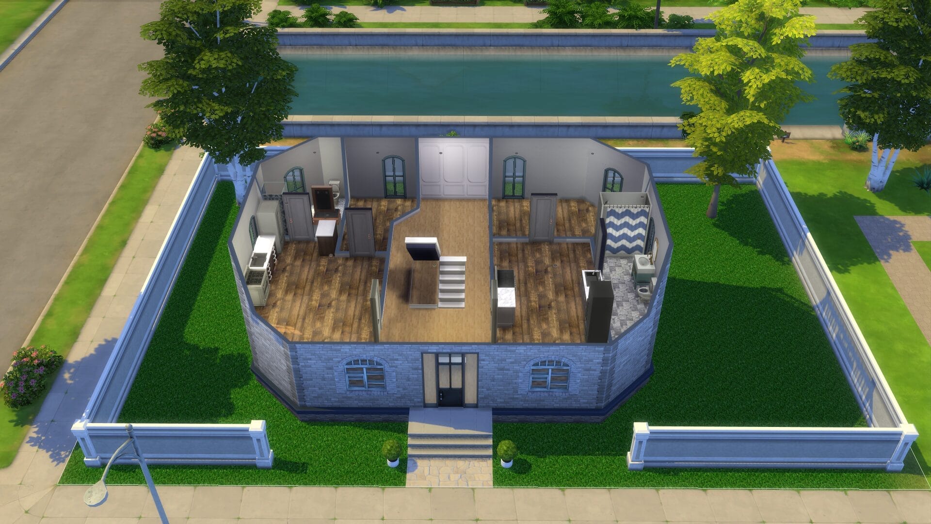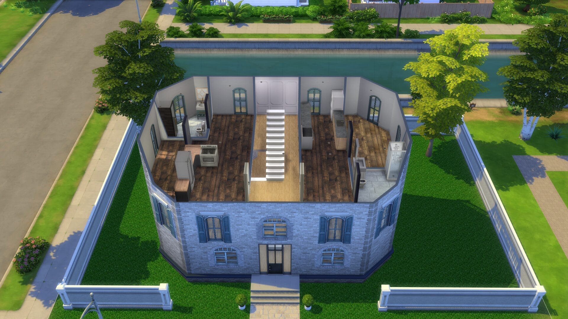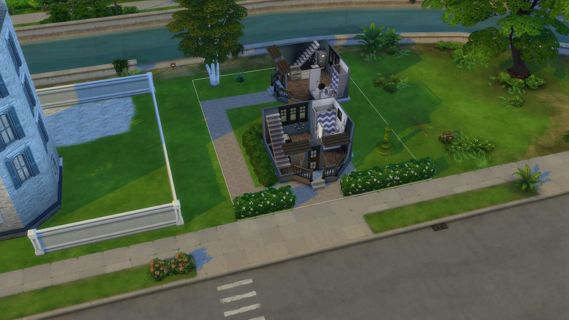 Sentinel Apartments – This was the first apartment building I built since For Rent came out. I might have went too far on its size. However, I absolutely love how it turned out and there are direct entrances to all the ground floor apartments. All of the homes/apartments on the canal have entrances on both side so that it looks good in manage worlds (I hated it looking like the back from afar). Some of the apartments have two stories. I’m excited to play this one in live mode. I always live in an apartment first with a sim because owning a house right off the bat feels “weird”.